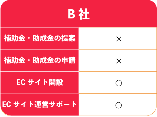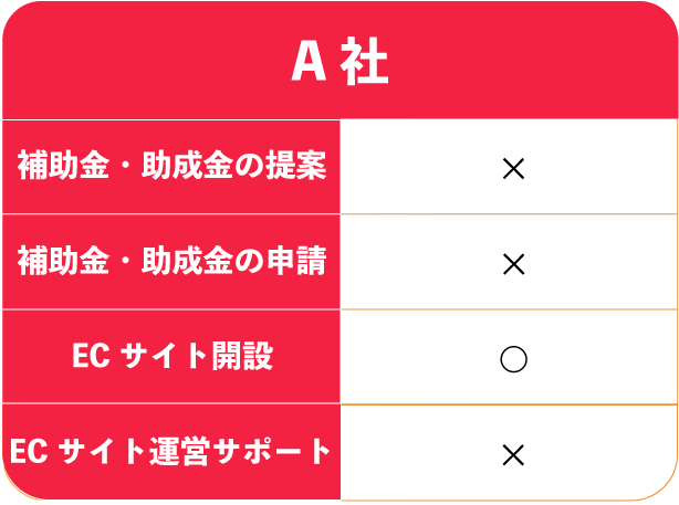 逆に補助金・助成金の申請代行の会社でECサイトの運営もしてくれる会社もほとんどないでしょう。