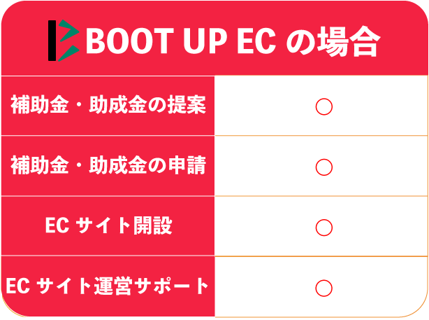 BOOT UP ECは補助金の申請、ECサイトの制作だけでなく、広告運用などのサポートも可能です。