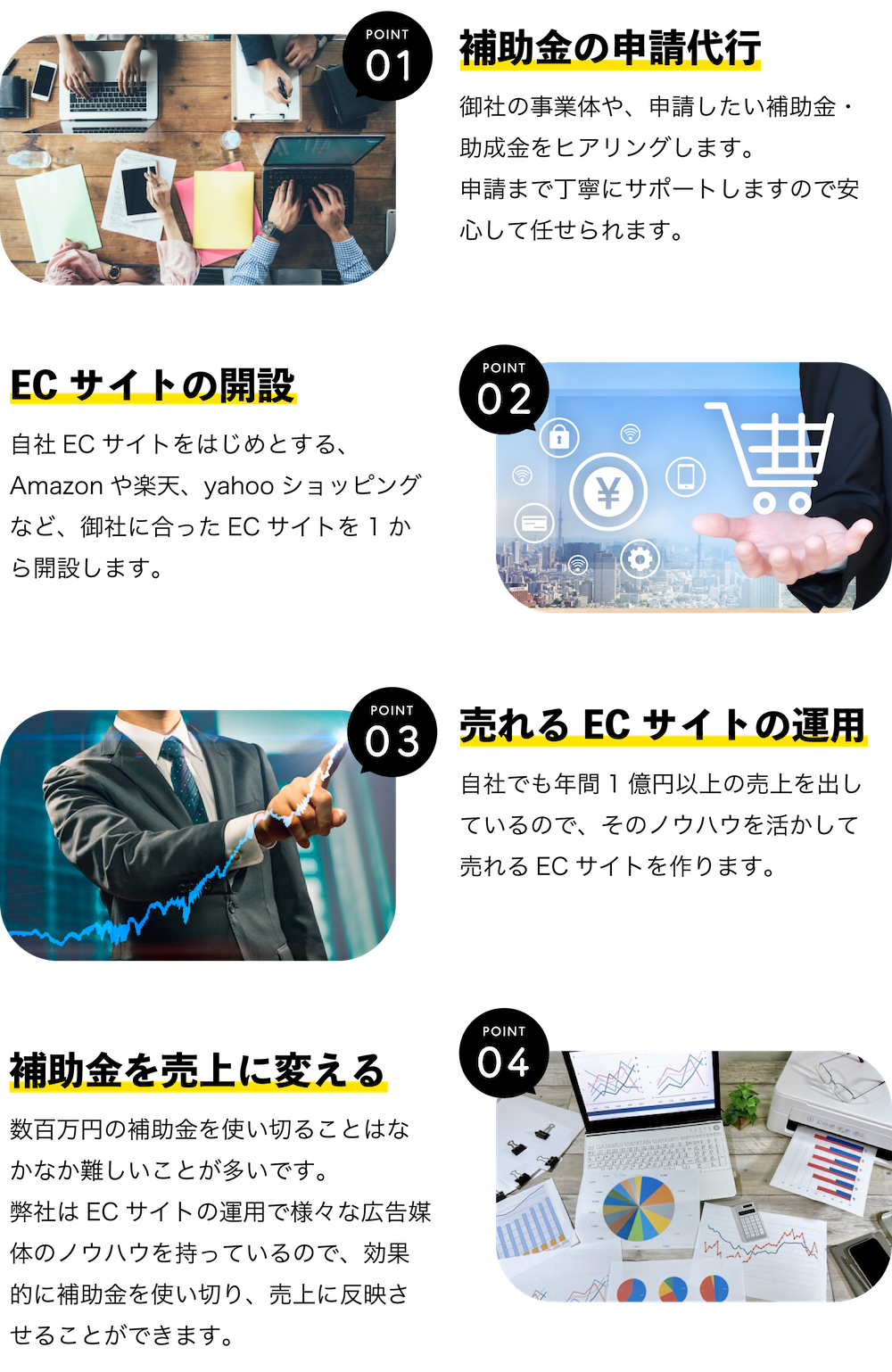 一般的なECサイトの代行会社は補助金・助成金の申請までは行なってくれません。